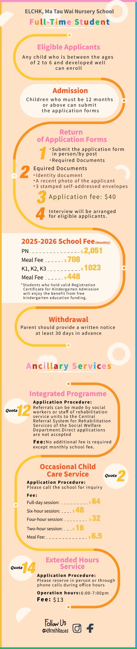Application Application Form Information on Admission to Admission to K1 Classes in the 202627 School Year Admission Arrangements for Nursery (K1) Classes in Kindergartens Profile of Kindergartens and Kindergarten-cum-Child Care Centres” 2025/26 School Year Online Application Major Paid Items